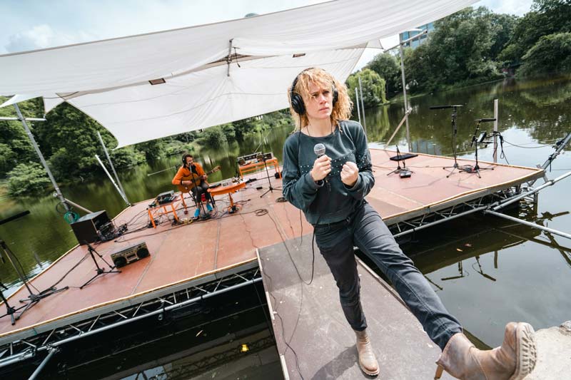 Katharina Andes designs the festival venues for asphalt and marks the performance spaces in the cityscape with artistic works. In her installations, the artist weaves together architecture and textiles, clothing and space in particular.