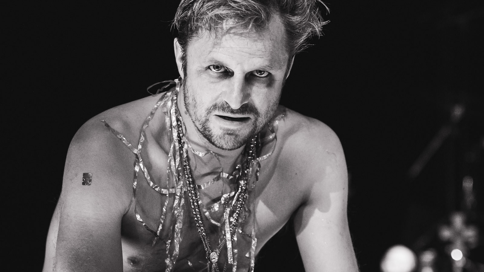 Through the use of electro beats and rock sounds the 100 year old mystery play Jedermann by Hugo von Hofmannsthal is transformed into a modern polyphonic spoken word concert. Just like a rock star, Philipp Hochmair makes the ‘story of the life and death of a wealthy man’ his own with raw, passionate effort. Hochmair slips into every role, his monologue is basically a dialogue with two microphones – one for Jedermann and one for the others. Pushed on by guitar chords and the experimental sounds of the band Die Elektrohand Gottes, Jedermann becomes recognizable as our contemporary, who burns up in his insatiable greed for money, love and ecstasy. The way Hochmair drives Jedermann from the height of his ostentatious life to his grave is an unforgettable event – between life and death he is catapulted by the music into a state of an unimaginable ecstasy.