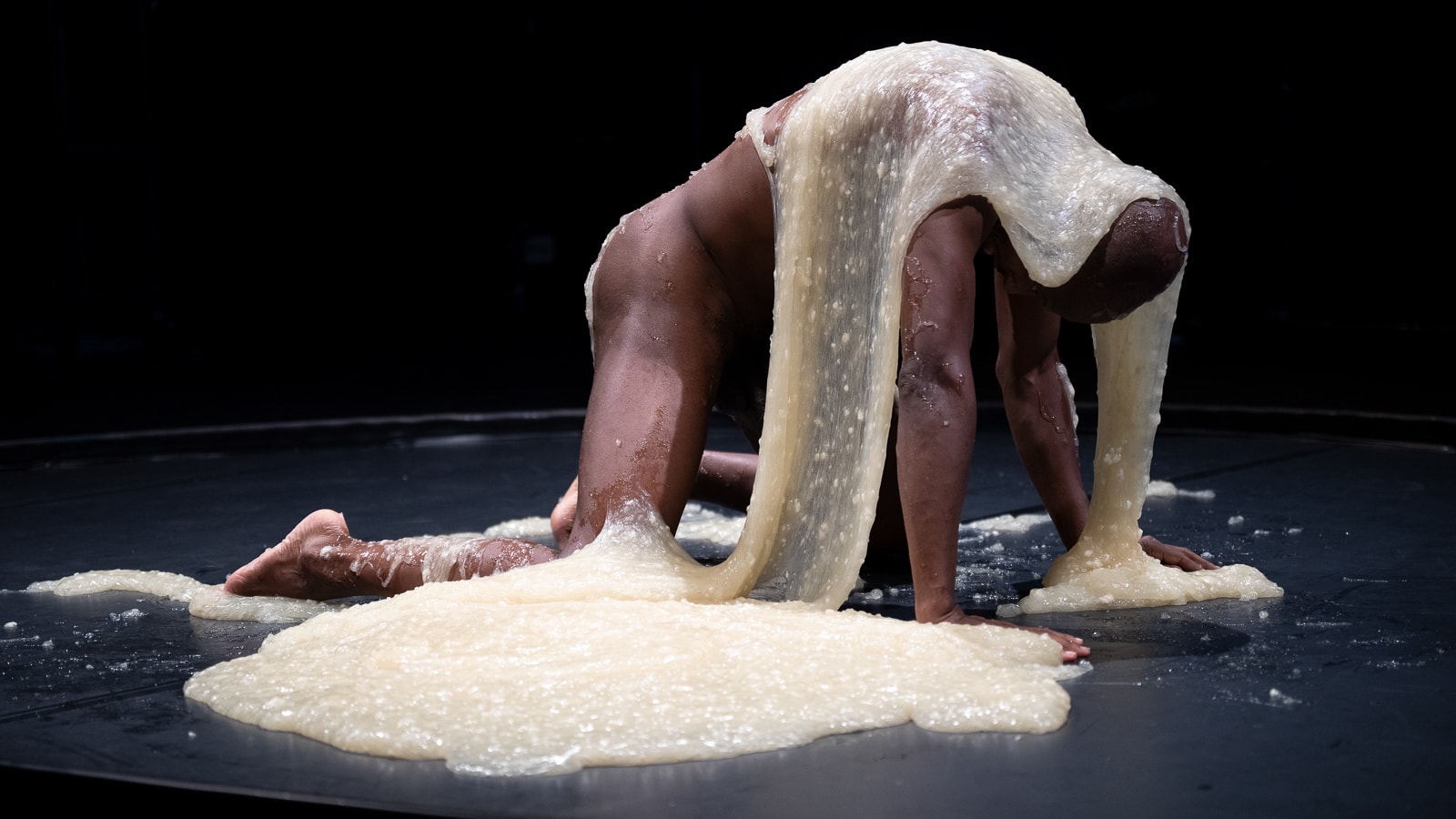 In ›Gootopia‹ (›goo‹ engl. für Schleim) interagieren sechs Performer:innen mit diversen Schleimsubstanzen. Der Schleim ist Material und Protagonist zugleich, er tanzt mit, auf, in und zwischen Körpern. Menschen und Schleim berühren sich, vernetzen sich, vermengen sich, bilden Allianzen. Es entstehen ständig neue Verbindungen, die Körpergrenzen werden fluide und Assoziationsräume für andere, schleimige, utopische Lebensformen eröffnet. Zwischen Horror und Faszination, Empathie und Ekel, Reiz und Irritation ermöglicht ›Gootopia‹ dem Publikum, in die Lebendigkeit stofflicher Prozesse einzutauchen.